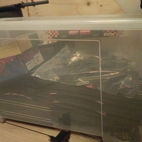 Det er brugt og men har mange timers leg i sig endnu, hvor mest slidte element er slæbesporene på bilerne