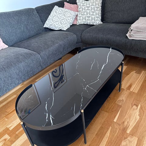 Sofabord i glas med marmorlook, ovalt design. Den sorte glasplade har hvide marmoraftegninger, mens stellet er i matsort metal. Bordet har en praktisk opbevaringshylde til fjernbetjeninger og andre småting. Mål: L: 123,5 cm, B: 53 cm, H: 38 cm