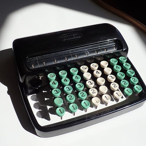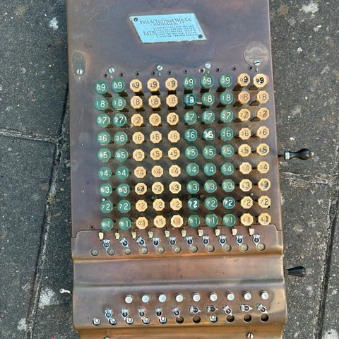 "Svinger" Regnemaskine fra ca. 1950. 75 år gammel. 2 forskellige kalkulationsmaskiner, som kan addere, subtrahere, gange (multiplicere) og dividere. MEKANISK. Blev indtil ca. 1970 anvendt i banker mv. til udregning af valutaværdier, dvs. kursværdi på køb og salg af udenlandske valutaer. Der var mange flere forskellige valutaer indtil EURO og andre nye valutaer afløste de tidligere valutaer i hvert enkelt land.