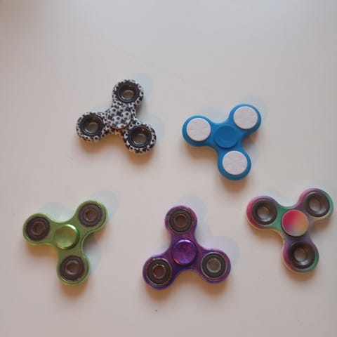 Sæt med 4 fidget spinnere i farverne gul, sort, grøn og gul med rød knap. Fremstillet i plastik med kuglelejer. Egnet til håndbrug for stressaflastning og finmotorisk træning.