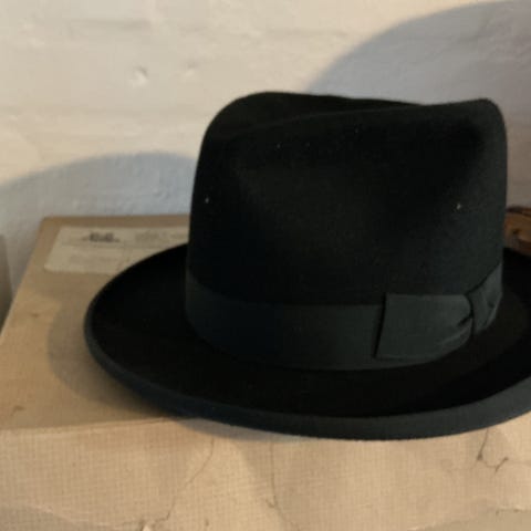 Hat, Moores, str. 6 7/8, sort , filt læder silke, Næsten som ny. Meget elegant "blød" sort Ambassador Homburg hat fra Moores i London - produceret på fabrikken i Denton. I meget fin stand. Omkreds 55 cm. Kan hentes i Kbh /Rådhuspladsen eller i Odense eller sendes gerne.
