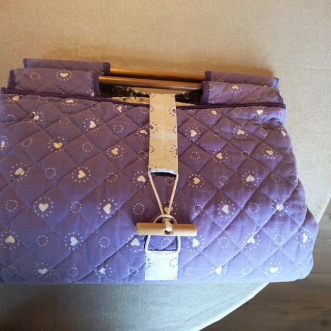 Kasse i rød farve. Kassen har metalbeslag og klaplåg med lås. Indvendigt foret med lyst materiale. Dekoreret med billede af Pusle dukke. Stand se billederne