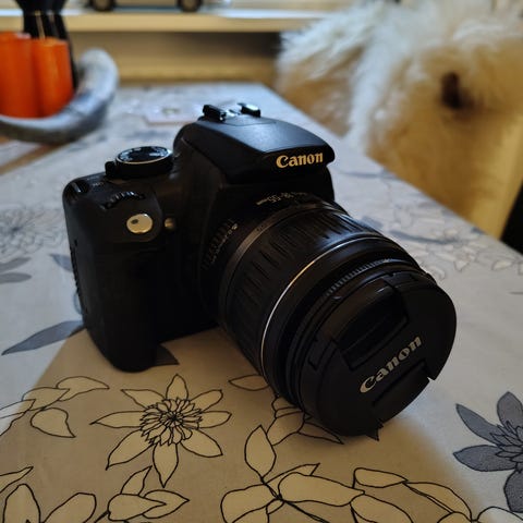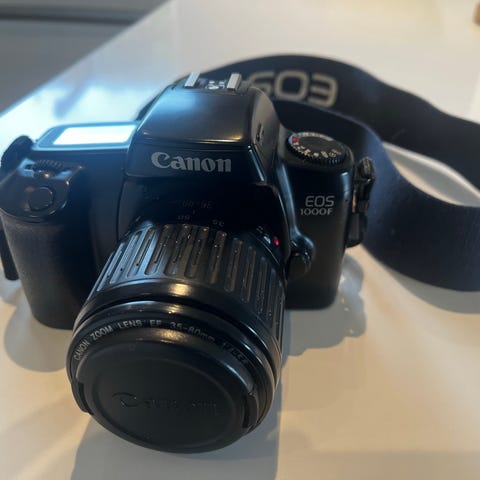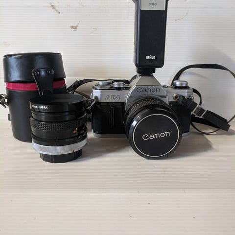Canon spejlreflekskamera med manuel betjening og optisk søger. Kameraet har et klassisk design med metal- og læderdetaljer.