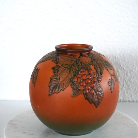 Vasen er i orange og grønne farver med motiv af 2 krager på en gren.