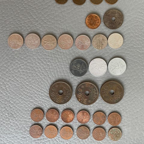 Danske mønter samling 25 øre, 1 krone, 2 kroner vurdering