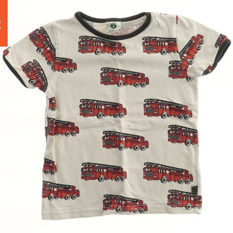 Langærmet t-shirt med brandbiler. T-shirten er lidt “nulret” som det fremgår af foto, men ellers er t-shirten i god stand; t-shirten er prissat herefter. Ingen huller eller pletter!