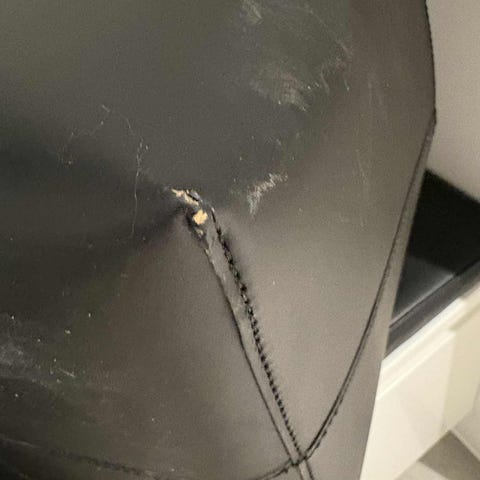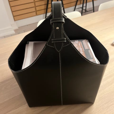 Magasinholder / brændeskure i sort kærnelæder. Designet af Jørgen Møller og fremstillet hos Torben Ørskov. Længde 30 cm, 28 cm og højde 37 cm med hank. Fra et ikke-ryger hjem.