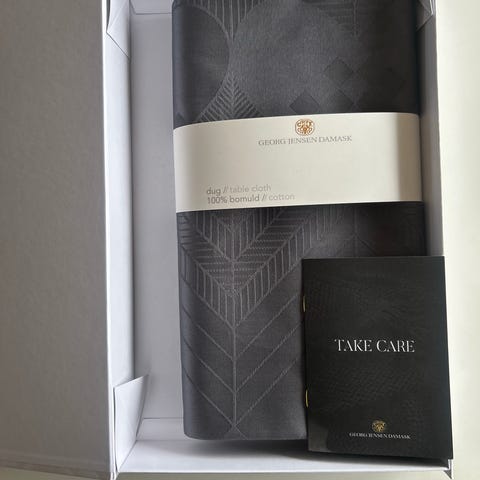 Georg Jensen Damask dug i størrelse 140x200 cm. Dugen er sart gul med et mønster af hvide blomster. Meget smuk dug. Aldrig pakket ud.