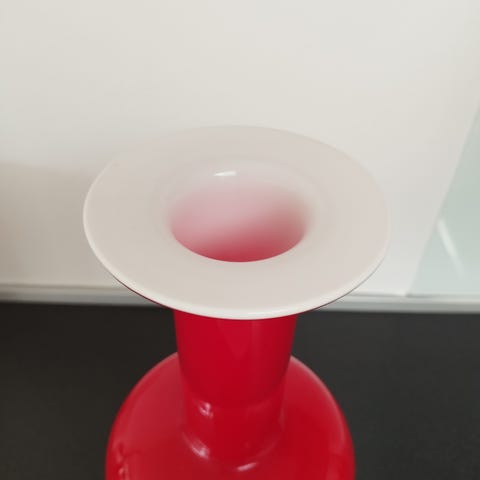 Holmegaard Kunstglas Vase af Otto Brauer i mørk rød og hvid opaque indvendig. Virkelig dekorativ. Højde 30 cm.