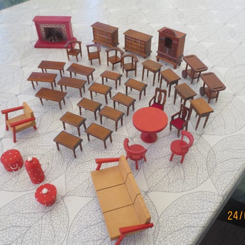 dukkehus træ mange møbler dukker og hestevogn træ