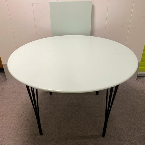 Bordet er ca. 115cm i diameter og kan forlænges til 153cm med plade. 4 stole medfølger gratis. Både bordet og stolene har tegn på aldersbrug, som vist på billederne.