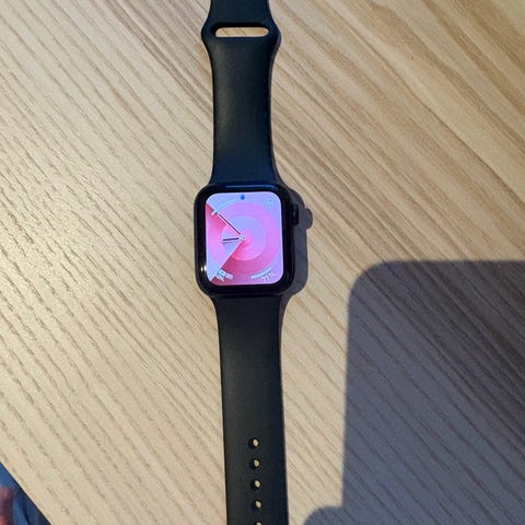 Apple smartwatch med hvidt silikonearmbånd. Uret har en firkantet skærm og er designet til at bæres om håndleddet. Armbåndet er justerbart med flere huller til tilpasning. Køber afhenter