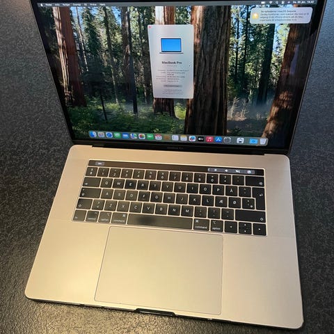 MacBook Pro 15” Touch Bar + ID 2,6 GHz 6-Core Intel core i7. 250gb harddisk, 16gb ram fra 2019.