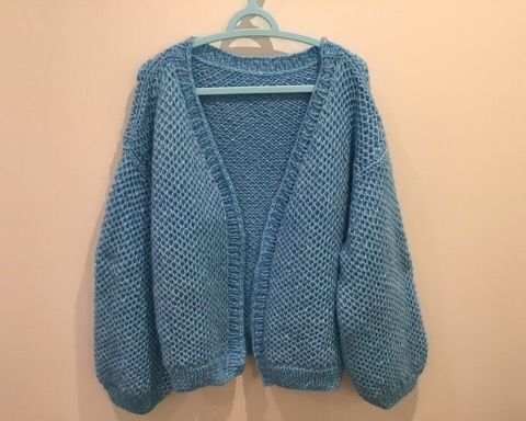 Cardigan til kvinder i størrelse L - XL, strikket i 100% uld. Cardiganen er æblegrøn og har knapper foran samt to lommer. Den er velegnet som yderlag eller til lag-på-lag brug.
