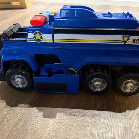 Stor politibil med lys og lyd. Når man trykker på en knap kan bilen åbne op og ud kommer Chase på motorcykel.