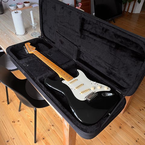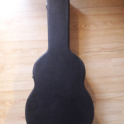 God og solid velholdt kasse til massiv elguitar. Har testet med en Strat og en SG, de kan være der - altså en ad gangen. Kun kontant afhentning.