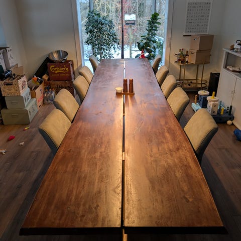 Spisebord I massivt træ til 12 personer. 305 cm langt, 80 cm bredt. Kan slibes og olieres efter behov. Benene er én stor træstub skåret over i to halvdele. Var lavet af frisk træ så har sat sig en smule. Er nu ca 6 år gammel. Har for det meste haft gennemsigtig dug på for at beskytte.