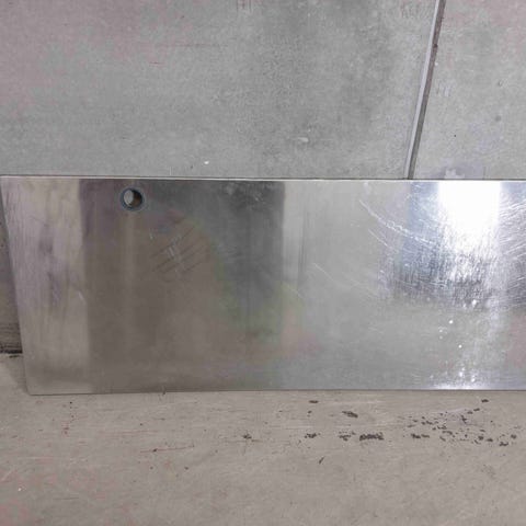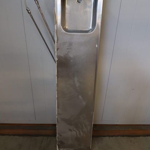 Rustfri stål bordplade med forhøjet bagkant 200x70cm. Bagkanten måler 4+4cm. Har brugsspor. Dimension B:200 X D:70 X T:4cm