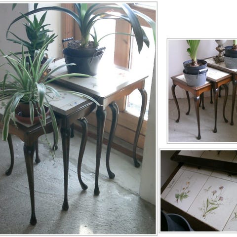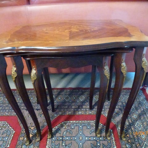 Sideborde med snoede ben. 2 stk Mahogni. Bordene er antik, og kan blive flotte i hvid eller du kan beholde det smukke mørke træ.