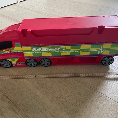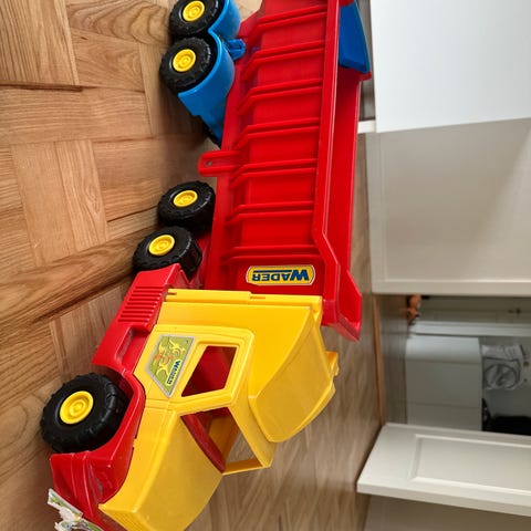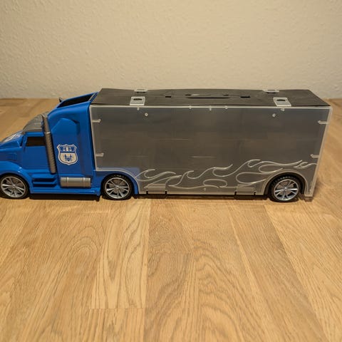 Lastbilen kan åbnes og der kan opbevares og køre biler i den.