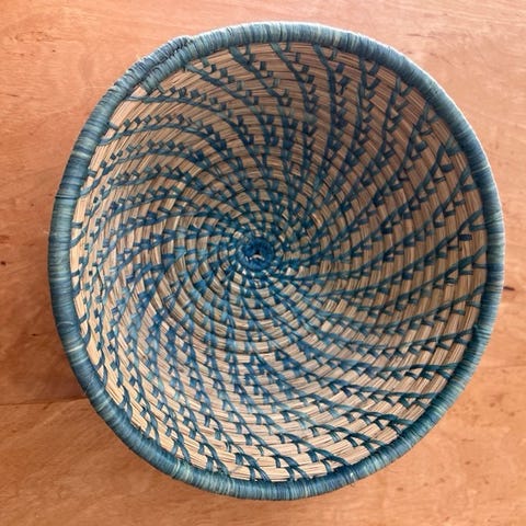 Kurven er lavet i naturfibre som søgræs/siv, med en smuk spiralformet bund og en kraftig, afrundet kant, der giver både styrke og karakter. Farvespillet er naturligt og levende – varme jordtoner, let patina og små variationer, som kun ægte håndværk kan skabe.