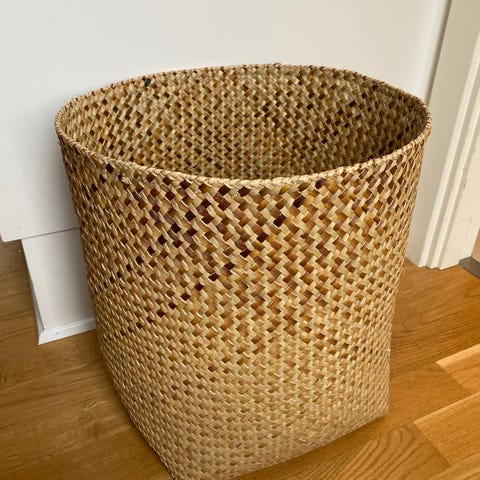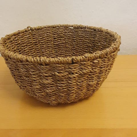 Denne kurv er flettet i hånden af naturens egne materialer – snoede fibre, der bærer spor af tid, gentagelser og rolige bevægelser. Man kan næsten mærke arbejdet i fletningen: tålmodigheden, rytmen og hænderne, der har formet den.