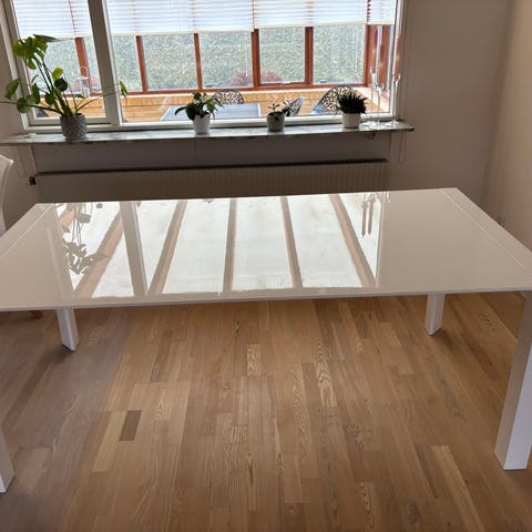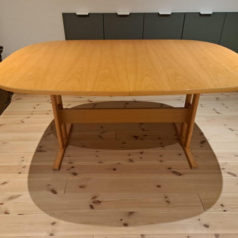 Spisebord til salg med ekstra udtræk hvis man ønsker den længere ellers har den en fin størrelse. Benene har mistet lidt farve med det kan man friske om med en lille smule sort maliling eller har den ingen ridser på bordpladen