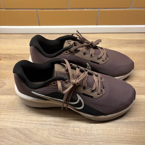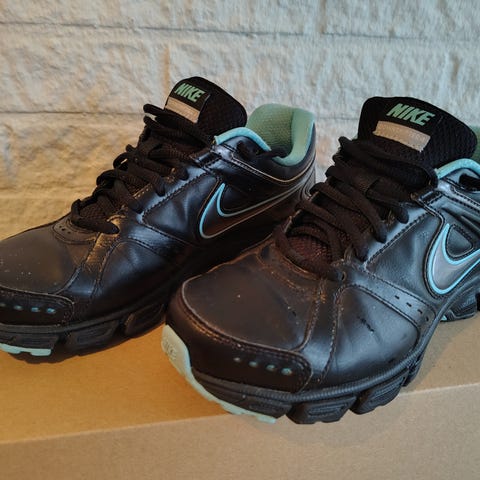 Nike Sneakers i størrelse 40. Skoene er sorte med hvide detaljer og har snørebånd. Sålens mønster er designet til greb og komfort.