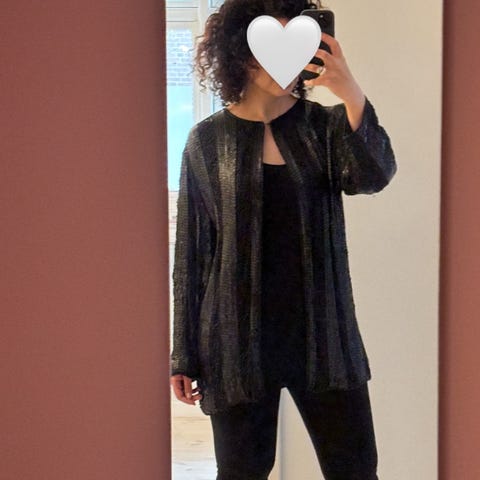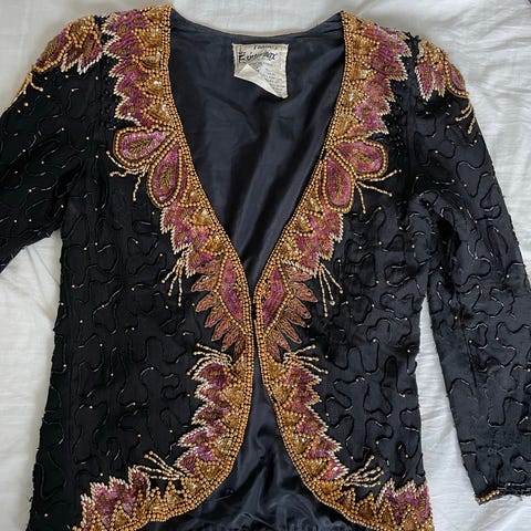 Vidunderlig smuk vintage jakke besat med hundredvis palietter. Den har lidt brugsspor indvendig, men er ellers i meget fin stand. Palietterne er stort set intakt og der er - så vidt jeg kan se - ingen løse tråde.