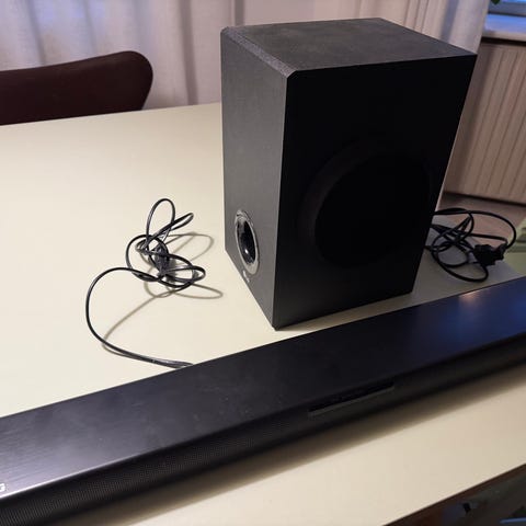 Stikket bagpå subwooferen sidder lidt løst, men selve ledningen sidder i, og subwooferen fungerer som den skal uden problemer.