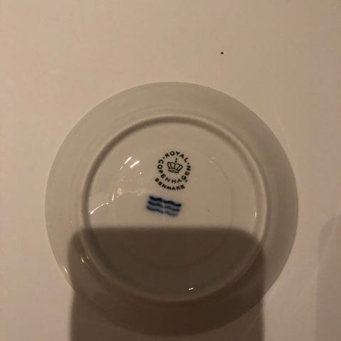 Underkop/ tallerken i hvid porcelæn fra Royal Copenhagen. Der er lidt forskellige slags. De koster 50 kr Per styk. Jeg sender ikke