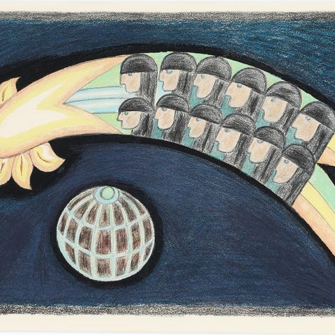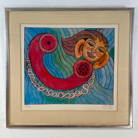 Litografi af Henry Heerup. Signeret : Heerup, 62/125. Størrelse 37 x 40 cm. Indrammet i træramme, der er sølv/sort malet. Rammemål 54 x 59 cm.