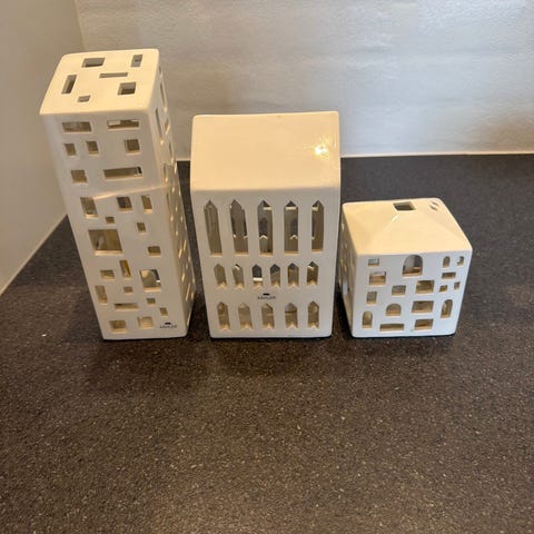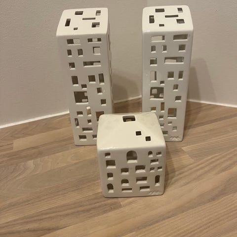 Kähler Urbania lyslygte i hvid porcelæn med firkantet design og udskårne firkantede vinduer. Dekorativ genstand, der kan anvendes til at skabe stemning med lys i hjemmet.