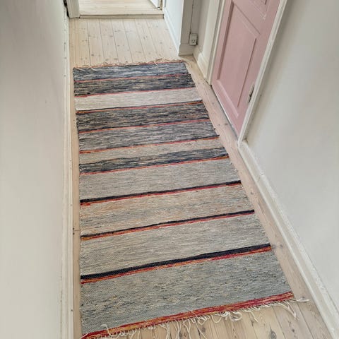 Farverigt kludetæppe. Tæppet måler 77x270cm