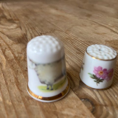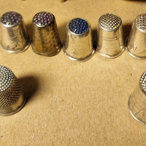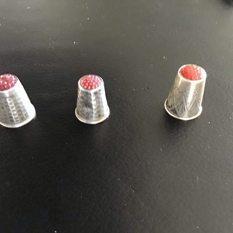 Svensk sølvfingerbøl med sten der har et afslag. I et elfenbenshus.