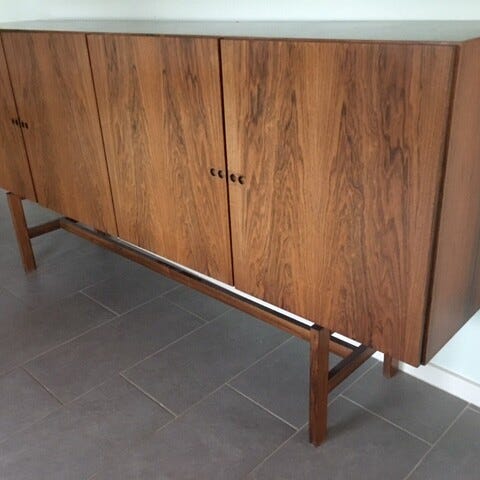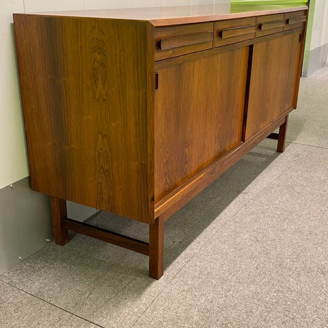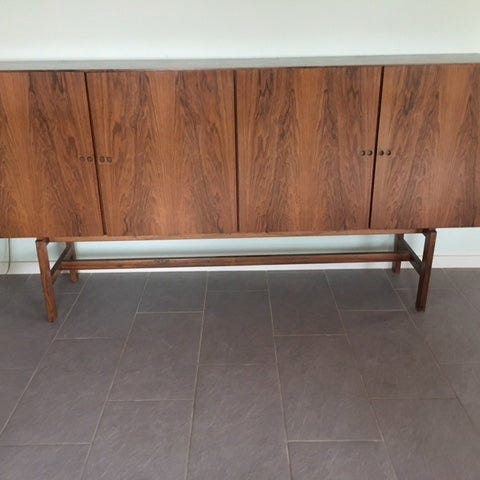 Erik Wørts. Lækker retro lav skænk i palisander. Front med 2 låger, indvendig med hylder. Bag lågerne er der en flot bar med indvendige spejle og tre smukke indvendige skuffer. Fremstår i super stand. Evt kan lev aftales