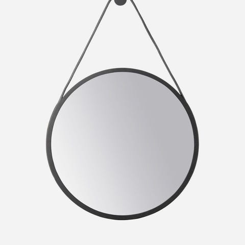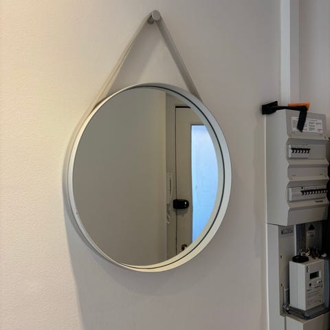 Hay Strap Mirror No 2 spejl med en diameter på 50 cm. Spejlet har en rund form og er designet med en enkel og moderne stil, velegnet til forskellige indretninger.