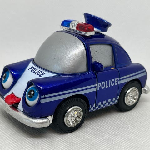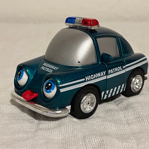 En sød lille Highway Patrol Politibil, når du trækker den tilbage og slipper den, så suser den med fuld fart fremad og tunge og øjnene bevæger sig, dørene kan også åbnes på Highway Patrol og til sidst trykker du på den røde knap på taget så er der fuld udrykning med sirener og blink.
