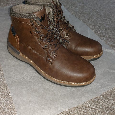 Støvler i størrelse 43 med brun farve. Støvlerne har snørelukning og en lys sål. Materialet fremstår som en kombination af læder og tekstil ved anklen. Helt ny, aldrig brugt.