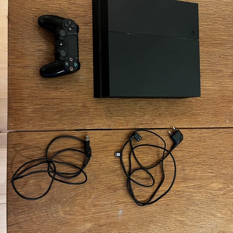 Sony Playstation 4 spillekonsol med to controllere og kabler
