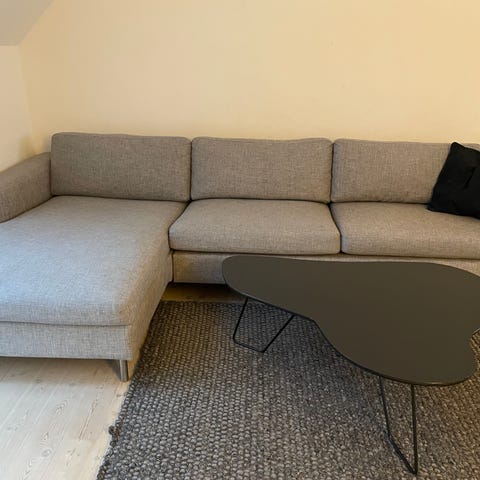 5-personers sofa med venstrevendt chaiselong (når man sidder i den). Brugt men i god stand. Der er et mærke på siden, som vi ikke har forsøgt at tage af. Derfor den lave pris