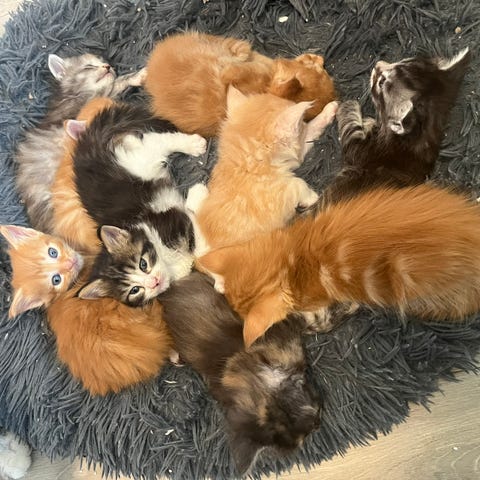 En blå tabby pige, 2 sort tabby drenge og 4 sort tabby piger.