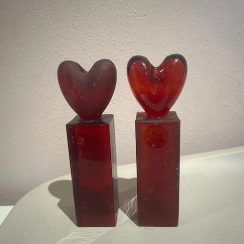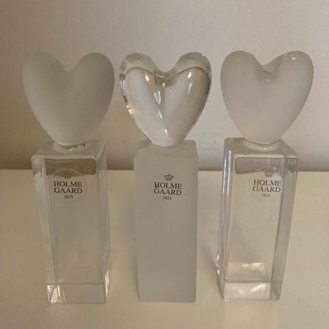 Holmegaard glasfigur med hjerteform, i klar og frostet glas. Dekorationsobjekt med to varianter, en i klart glas og en i frostet glas.
