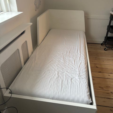 IKEA seng med udtræksseng i hvid træ. Sengen har en hovedseng og en udtræksseng, som giver mulighed for ekstra soveplads. Materialet er træ med hvid finish. Sengen er velegnet til børneværelse eller gæsteværelse.