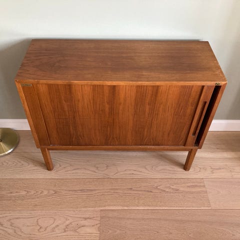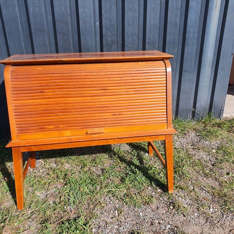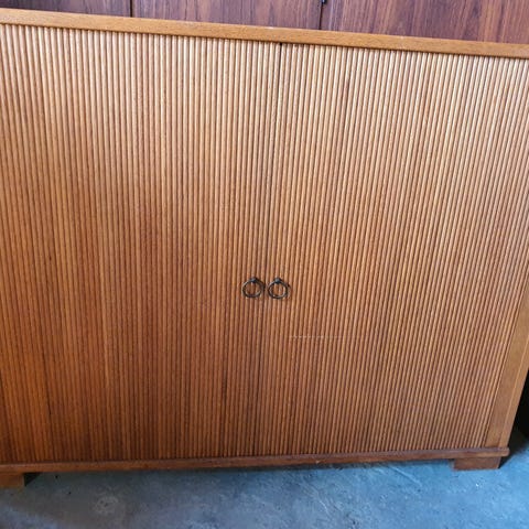 Jalousiskab i teaktræsfiner med sorteringsrum og hylder.