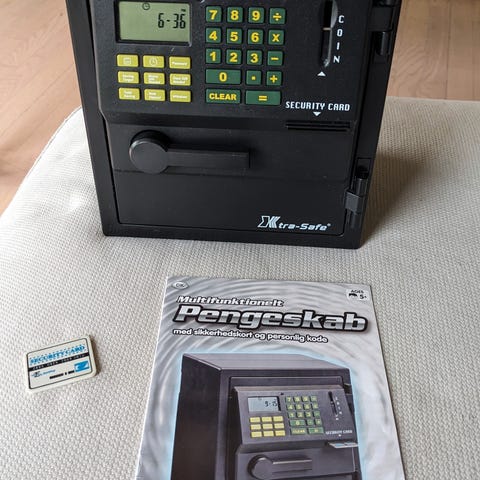 Pengeskab med møntindkast i toppen og hvor man kan åbne døren. Det låses ved valgfri kode. Manual medfølger.