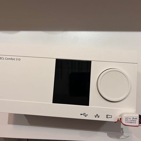 ECL Comfort 210 termostat med digitalt display og drejeknap til styring af rumtemperatur. Enheden har en USB-port og forskellige tilslutningsmuligheder bagpå for integration i varmesystemer.