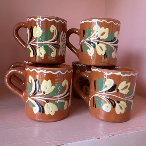 Keramik fra eget hobbyværksted. Kopper i forskellige flerfarvede glasurer og varierede farvemønstre. Hver kop kan indeholde ca. 300 ml.