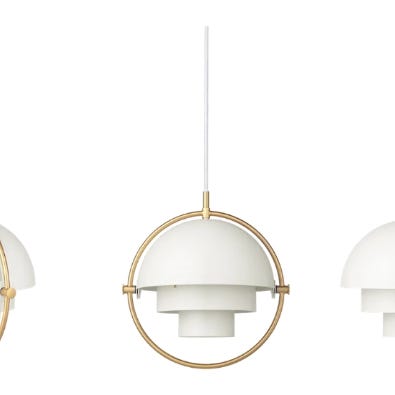 Large Gubi MultiLite ceiling lamp pendant in white with brass hardware.