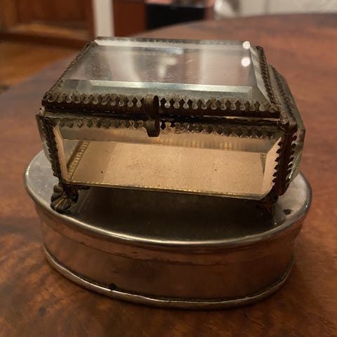 Fransk opsats til smykker af forgyldt bladværk, indfattet med små spejle og rød fløjlspude. 1800-tallet.